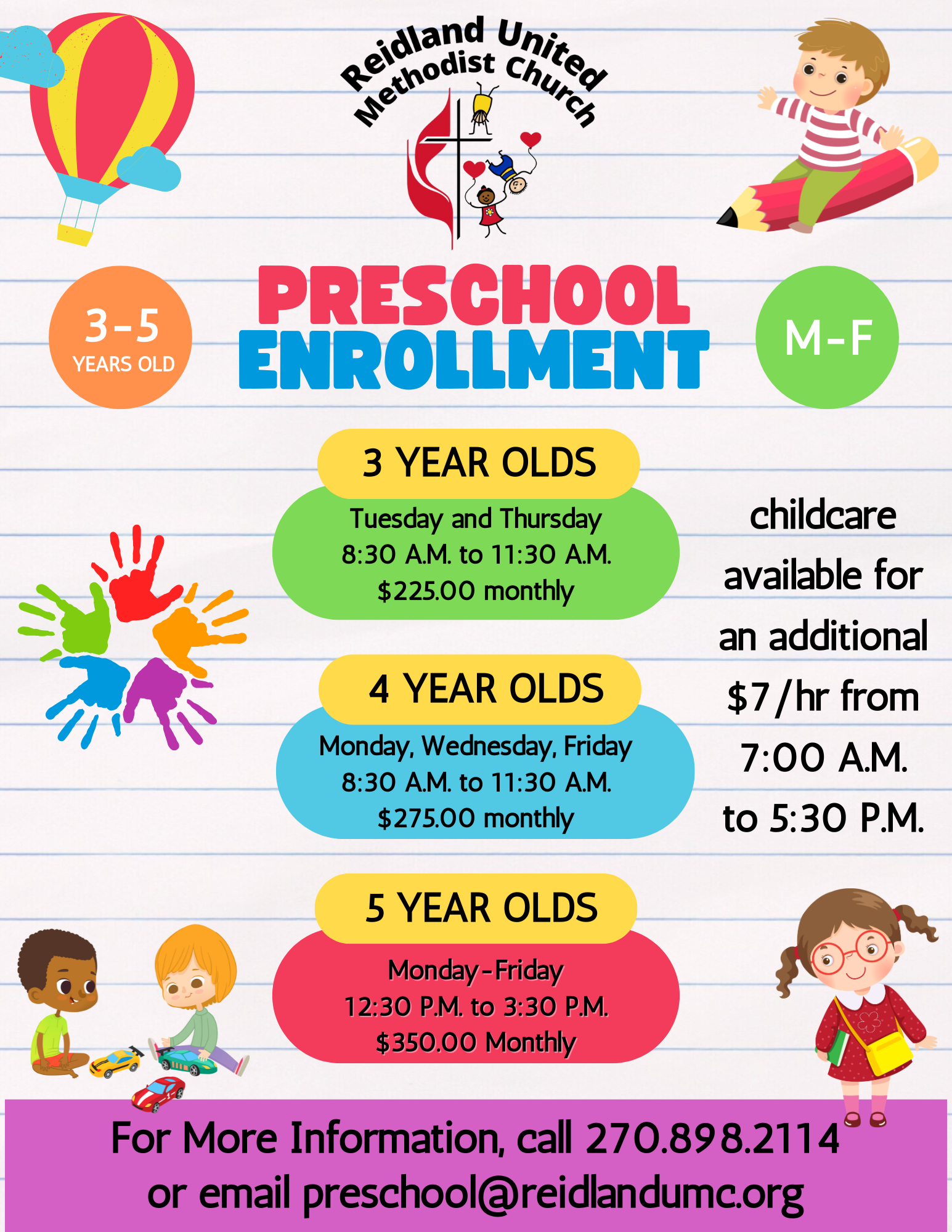 Reidland United Methodist Church Preschool is now enrolling for children ages 3–5. Choose the class schedule that fits your family, with optional extended childcare available.